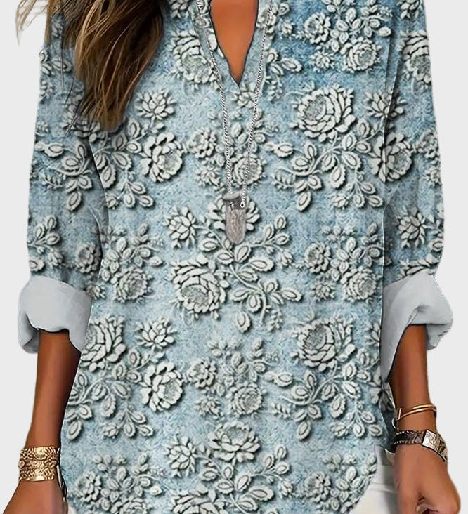 Mėlyna lininė bliuska su volanais ir dryžuotomis detalėmis