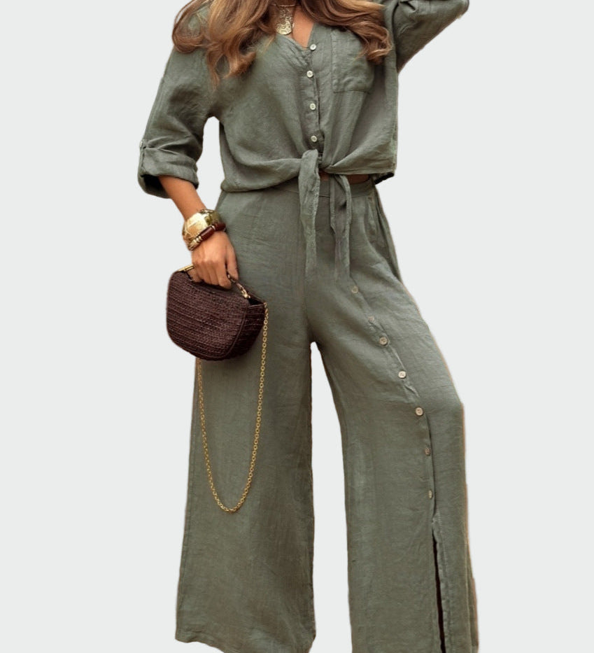 Moteriškas Neformalus Komplektas su Topu ir Kelnėmis su V Iškirpte