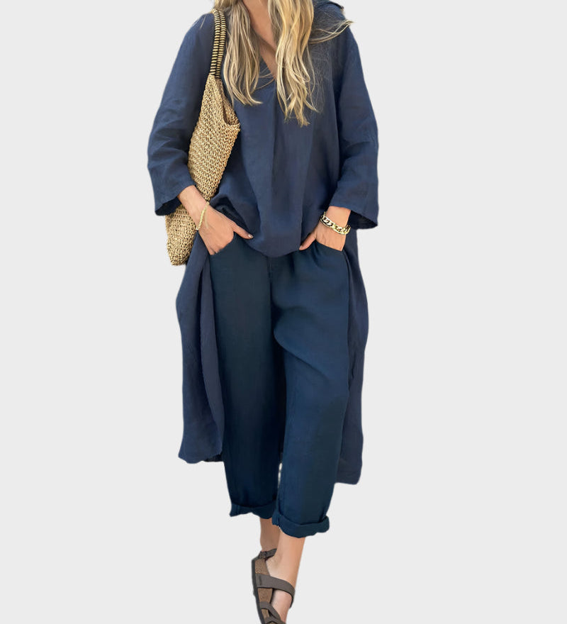 Stilingas Derinys su Ilgu Marškinėliu ir Kelnėmis, Moderni Paprastumas ir Patogi Srautas