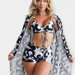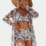 Šis modernus komplektas sujungia komfortą, stilių ir eleganciją, kad sukurtų išbaigtas vasaros išvaizdas. Aukšto juosmens bikini glosto siluetą, viršus su kaspinu pabrėžia krūtinę, o lengvas paplūdimio drabužis suteikia rafinuotumo ir universalumo.
