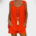 Tobulas vasaros šik rinkinys, derinantis gaivumą ir eleganciją. Be rankovių marškinėliai su V formos iškirpte subtiliai atskleidžia dekoltė, o šortai suteikia patogią prigludimą ir moterišką siluetą. Modernus rinkinys kiekvienai dienos akimirkai.