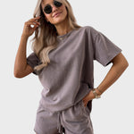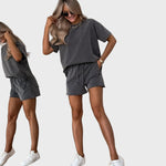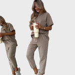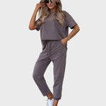 Šis patogus dviejų dalių komplektas švelnios pilkos spalvos derina stilių ir patogumą, puikiai tinkantis kasdienėms išvaizdoms. Minimalistinis dizainas suteikia elegancijos, nesumažinant komforto.