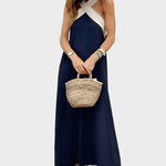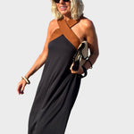 Ši be rankovių suknelė su ypatingu dizainu krūtinėje yra puikus pasirinkimas šiltoms dienoms ir elegantiškoms išvaizdoms. Natūralių atspalvių derinys ir kryžminis kaklas išryškina moteriškumą su paprastumu ir stiliumi.