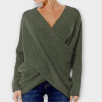 • Stilingas V-žandikaulio dizainas: Modernus kryžminis V-žandikaulis ir asimetrinė apačia suteikia ypatingą akcentą šiam megztiniui.