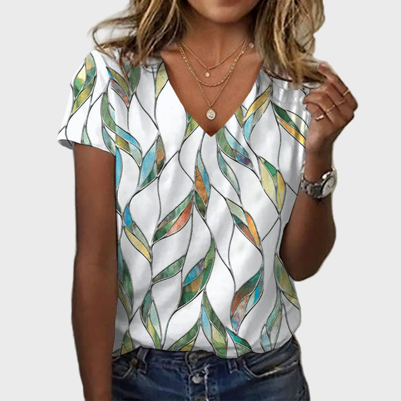 Parodykite modernią savo stiliaus pusę su šiuo balto pagrindo marškinėliu, dekoruotu spalvingais banguotais raštais žalių, mėlynų ir auksinių atspalvių. V formos iškirptė suteikia moteriškumo, o laisvas siluetas užtikrina komfortą ir eleganciją bet kuriai progai.