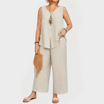 Laisvas ir rafinuotas komplektas, derinantis minimalistinį stilių su moderniu charakteriu. Be rankovių marškinėliai su subtiliu iškirpimu priekyje ir plačios kelnės sukuria rezultatą, kuris skleidžia komfortą ir stilių.