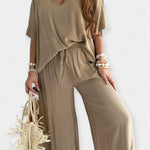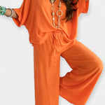 Šis komplektas yra atsipalaidavusios elegancijos įsikūnijimas. Plataus kirpimo kelnės su patogiais klešniais harmoningai derinamos su palaidine, turinčia V formos iškirpimą ir plačiomis rankovėmis – stilius, kuris kvėpuoja ir puošia bet kurią siluetą.