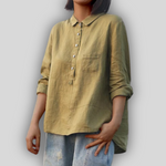 Klasikinė lininė bluzonė, kuri skleidžia diskretišką eleganciją ir kasdienį komfortą. Ji turi klasikinius mygtukus priekyje ir praktišką krūtinės kišenę. Atsitiktinis siluetas ir ilgos rankovės su sukimo galimybe daro ją idealia visoms dienos valandoms.