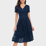 Ši suknelė skirta svarbiems momentams. Su savo figūrą dailinančiu V formos iškirpimu, subtiliu gėlėto nėrinių sluoksniu ir sklandžia A silueto forma, ji idealiai tinka vestuvėms, kokteilių vakarėliams ir elegantiškoms naktims. Trumpi rankoviai prideda šiek tiek rafinuotumo, o vėduoklės detalės daro ją stilingą be pastangų.