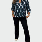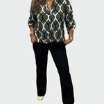 Moteriški **kasdieniai marškiniai su moderniu geometriniu raštu** chaki ir baltos spalvos tonais. Laisvas dizainas kartu su sukabintomis rankovėmis suteikia komfortą ir eleganciją, todėl jie puikiai tinka tiek kasdieniams, tiek formalesniems renginiams.