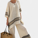 Ramybės stilius su laikina jūrine atmosfera. Daisy komplektas traukia dėmesį savo kontrastingų juodų linijų ir natūralios foninės spalvos deriniu, sukeldamas atsipalaidavusios elegancijos jausmą. Jo erdvi siluetas ir lengvas audinys daro jį puikiu kompanionu šiltomis klimato sąlygomis ir lėtoms dienoms.