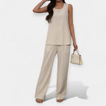 Idealiai tinka šiltoms dienoms, šis komplektas siūlo paprastą patogumą ir minimalų estetiką. Rankovių tatu švelniai apglėbia kūną, o plačios kelnės suteikia erdvės ir elegancijos jūsų kasdienei išvaizdai.