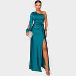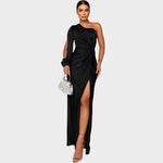 Ši vakarinė suknelė spinduliuoja rafinuotumu ir moderniu dizainu. Asimetriška forma su vienu rankovė ir efektingai susiraukšlėta detalė juosmenyje pabrėžia moterišką siluetą, o gilus iškirpimas prideda šiek tiek seksualumo ir elegancijos. Ji idealiai tinka šventinėms progoms, gala vakarienėms ar ypatingiems renginiams, kuriuose norite spindėti ir palikti nepamirštamą įspūdį.