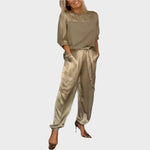Satino komplektas su laisva palaidine ir cargo kelnėmis